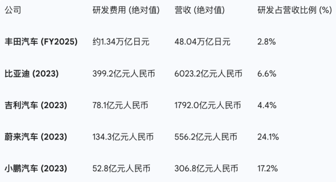 丰田的比例长期保持在3%的水平,2025财年为2.8%,而中国车企,特别是新能源车企,研发投入的强度要高得多。