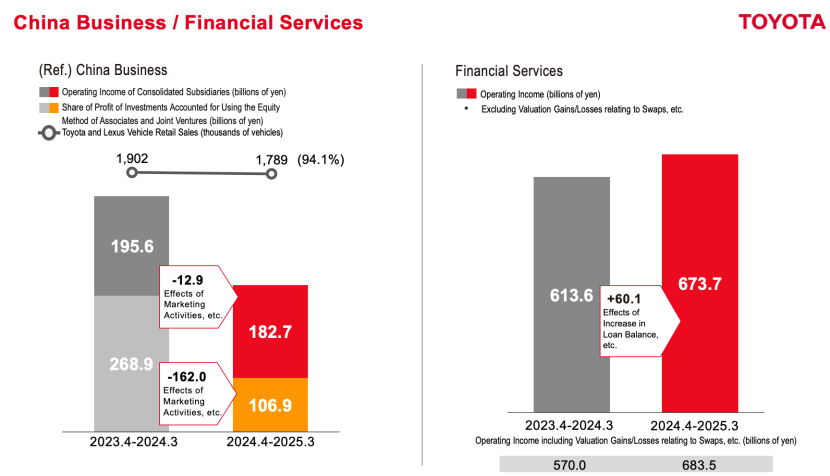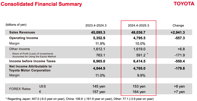 首先我们来看丰田2025财年(2024年4月1日至2025年3月31日)的成绩,严格意义上来说,这个比2024财年的巅峰稍微差了一些,但也是丰田历史上最好的成绩之一。