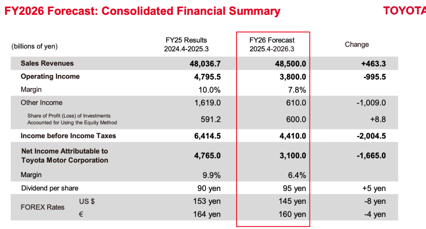 丰田在财报里发布了自己对2026财年的业绩预测,所有指标几乎全线下滑,这暴露了丰田潜藏在水面之下的巨大压力。