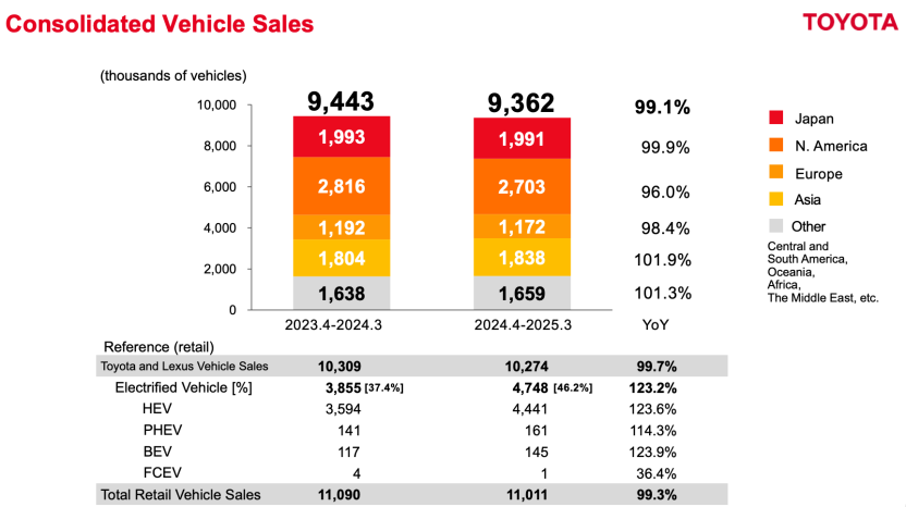 我们可以看到,在丰田2025财年销售的935万辆汽车当中,燃油车占到总销量的53.8%,电动化汽车占到总销量的46.2%,而混合动力汽车 (HEV)是电动化车型中的绝对主力,占到了9成之多,纯电占比很少。